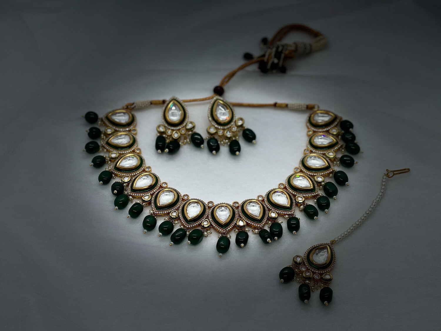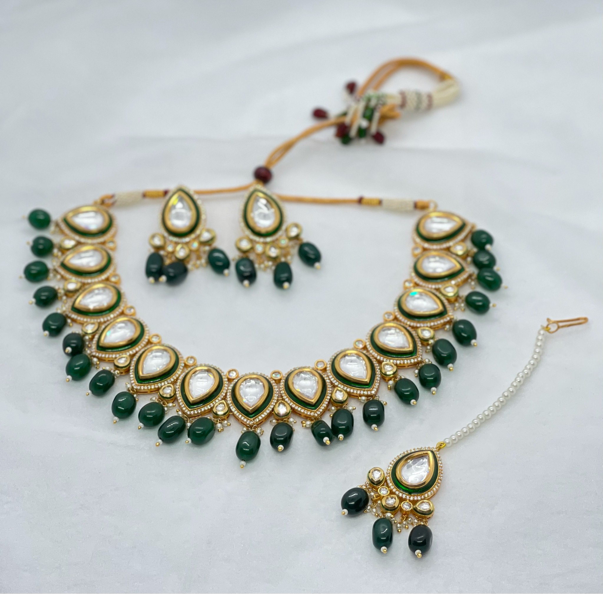 A great combination of real Kundan and real fresh quality American diamonds. Heavy in look, light in weight. A rich green look.
