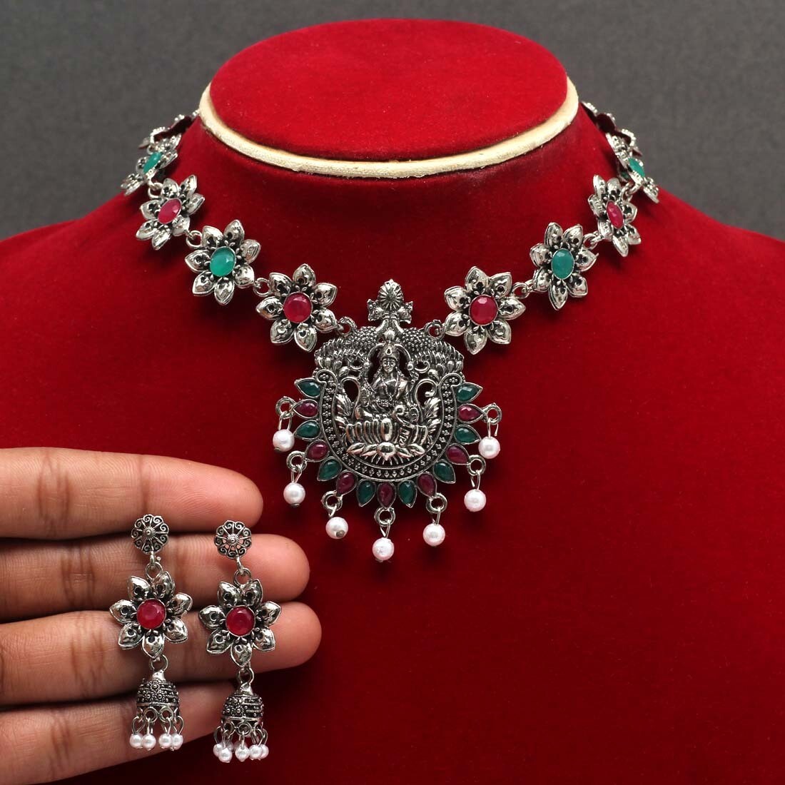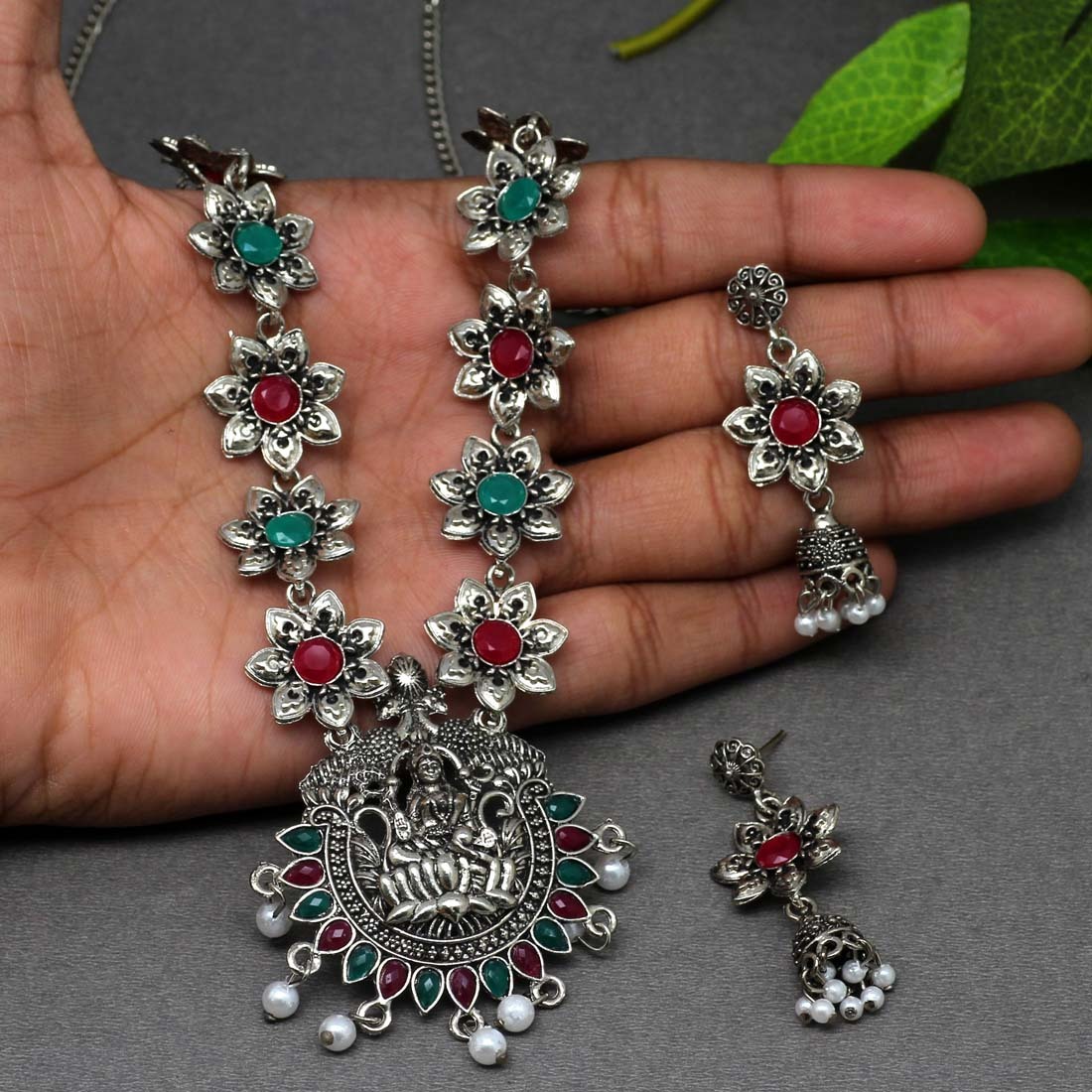 Maroon & Green Color Glass Stone Oxidised Necklace Set