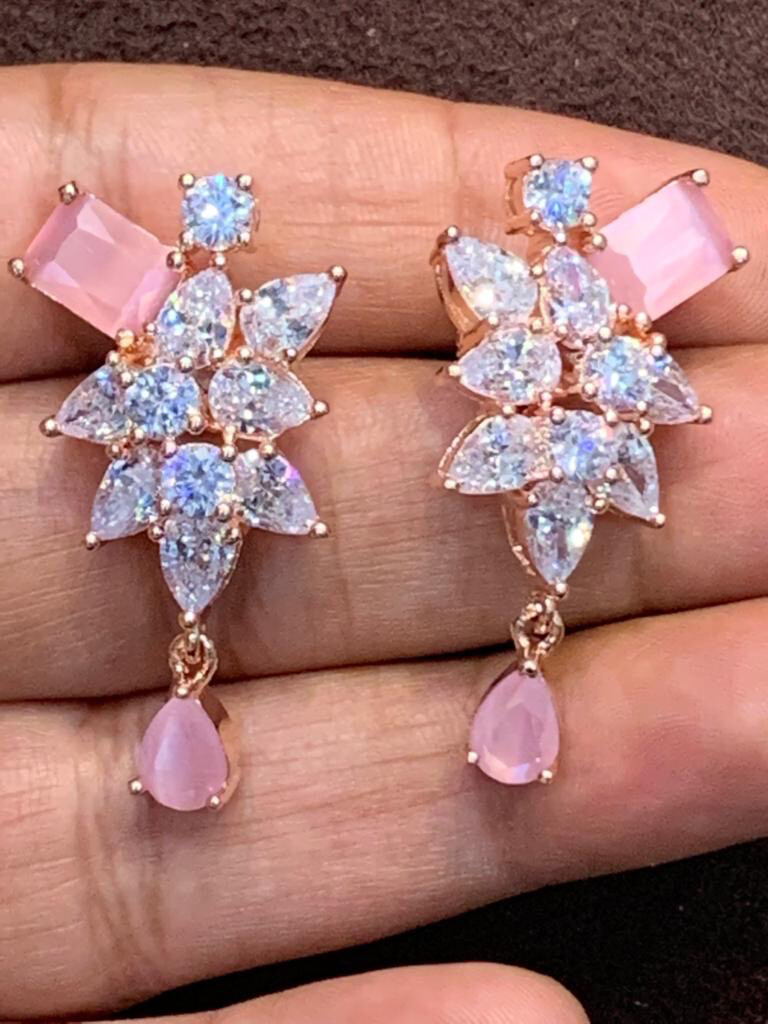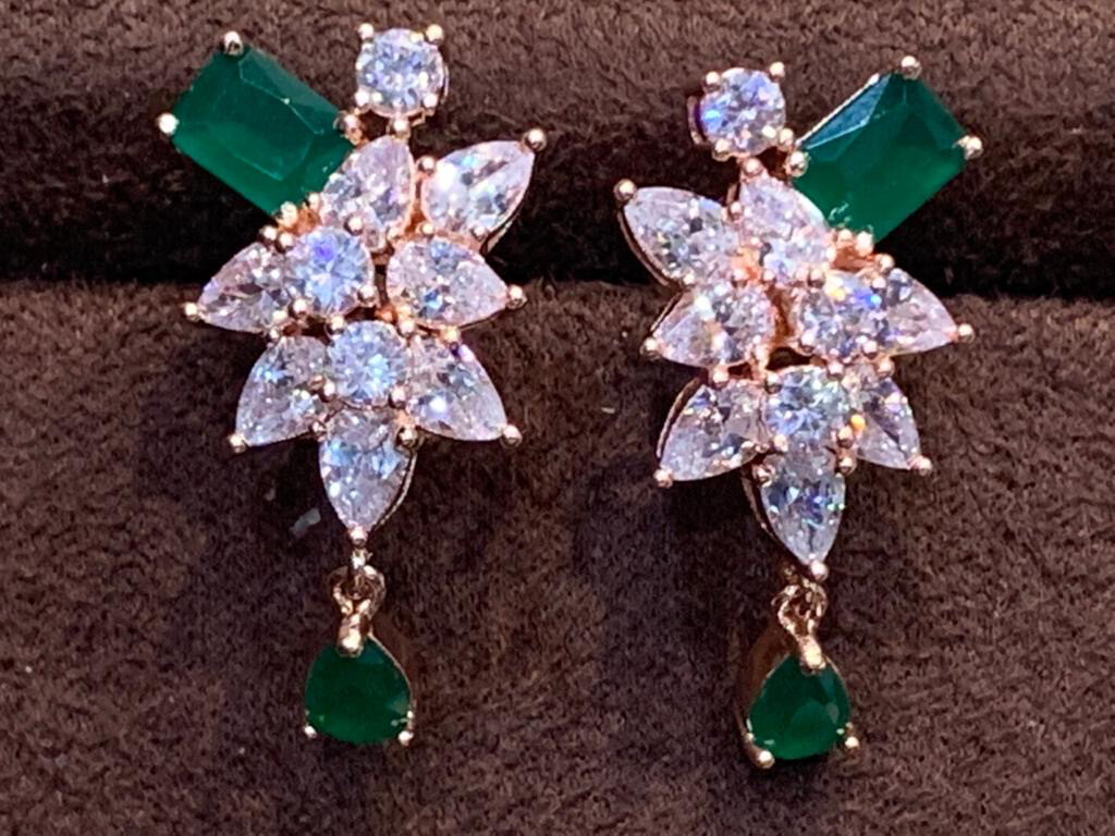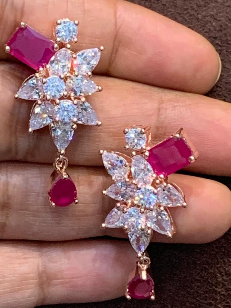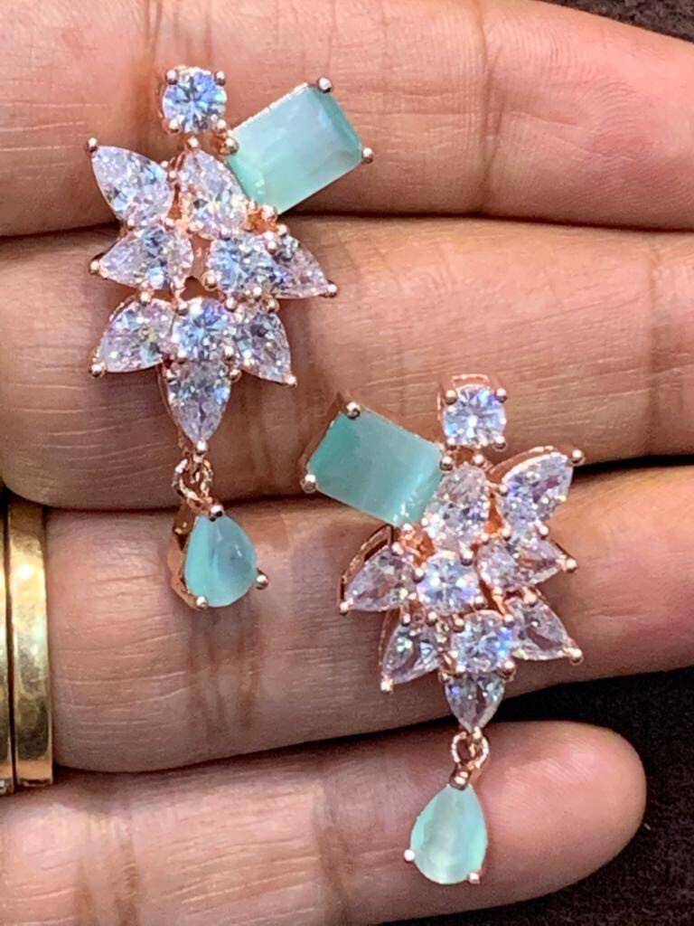 MINNIE is a little yet bright earrings made with semi precious stones in Rose gold plated Alloy. MINNIE is made with Premium quality American Diamond with Lab created stone (Ruby, Emerald, Onyx).