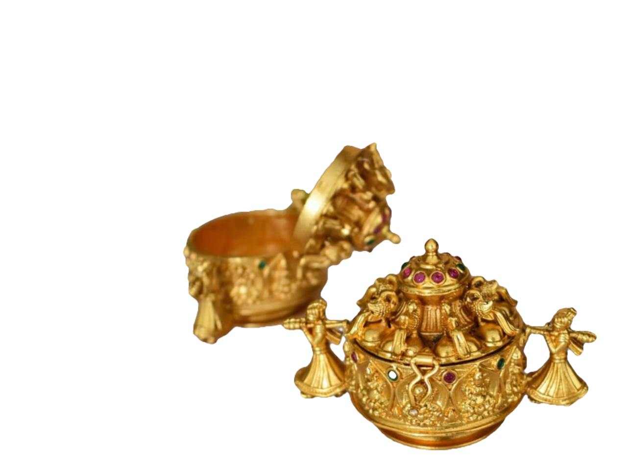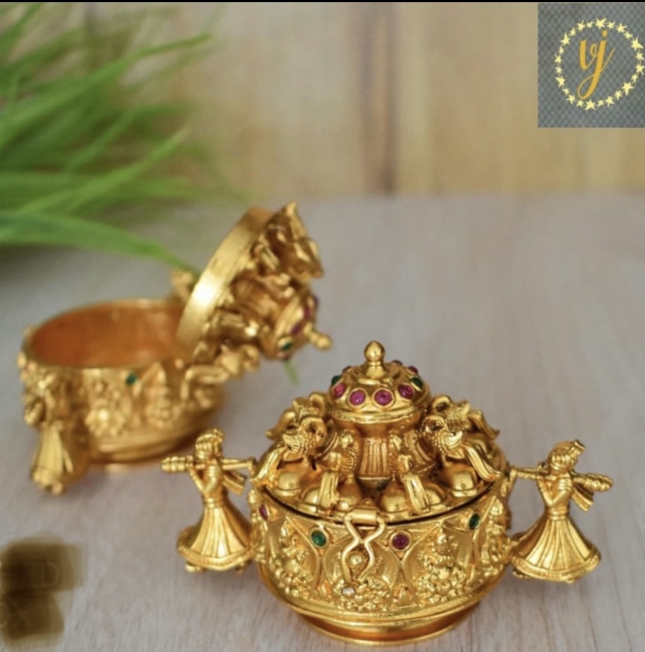 A beautiful kumkum pot with a top quality Gold polish to give it that antique and royal look along with cute design. A must have piece of art to accentuate your jewelry collection