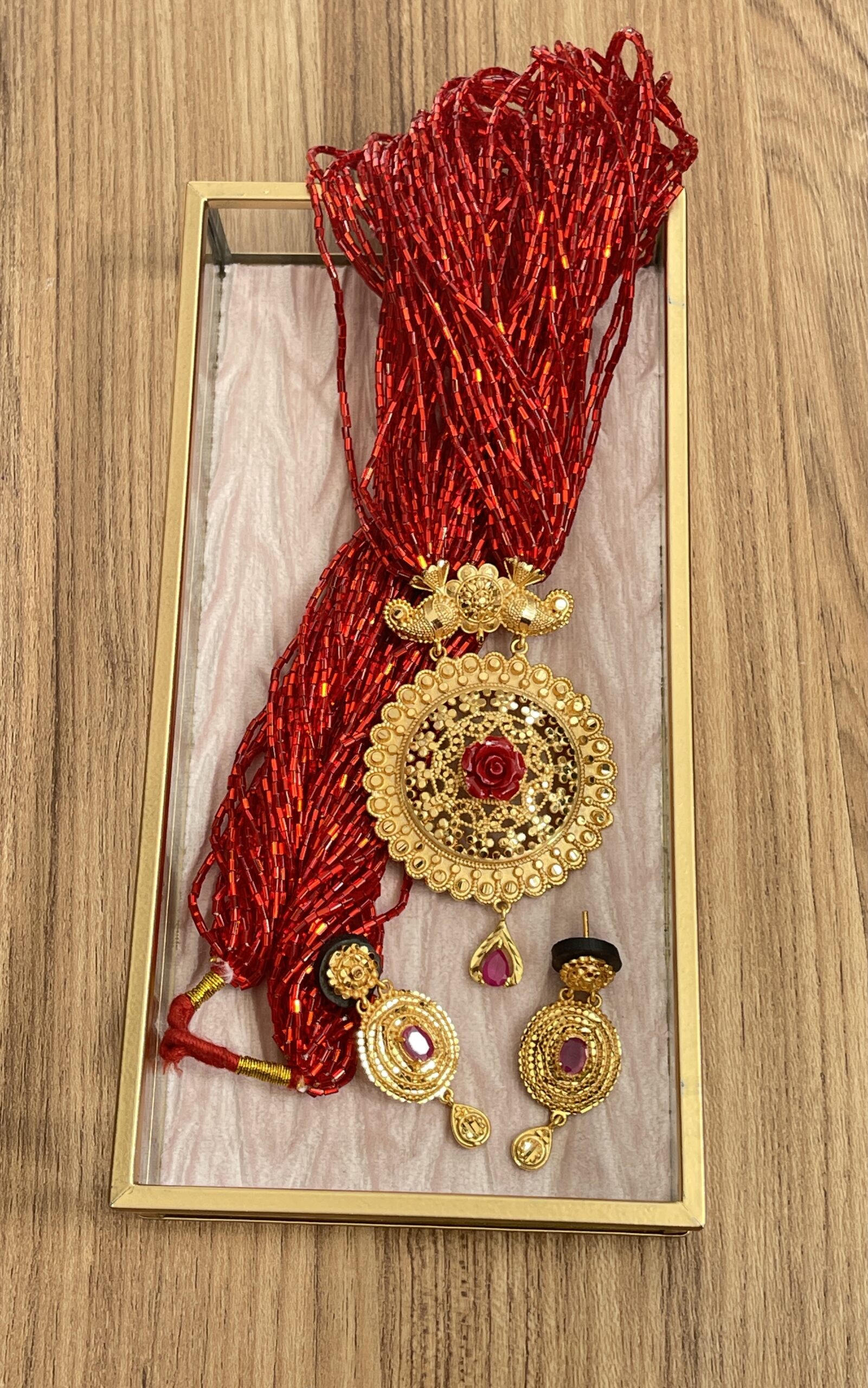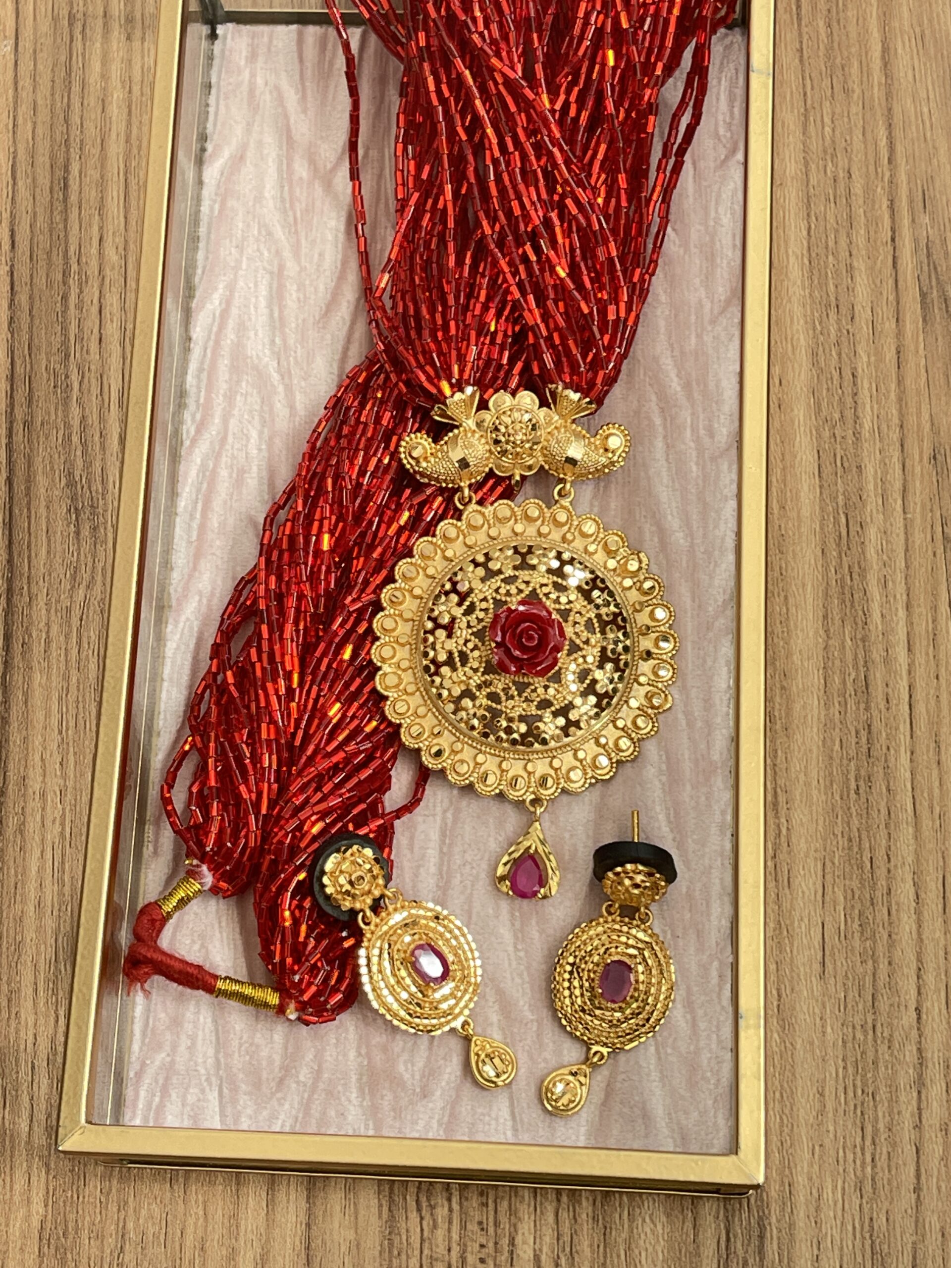 Modern design incorporated on traditional Tilhari to give it extra beauty and elegance. It goes great with any Nepalese traditional attire. Matching earring is a cherry on top!!