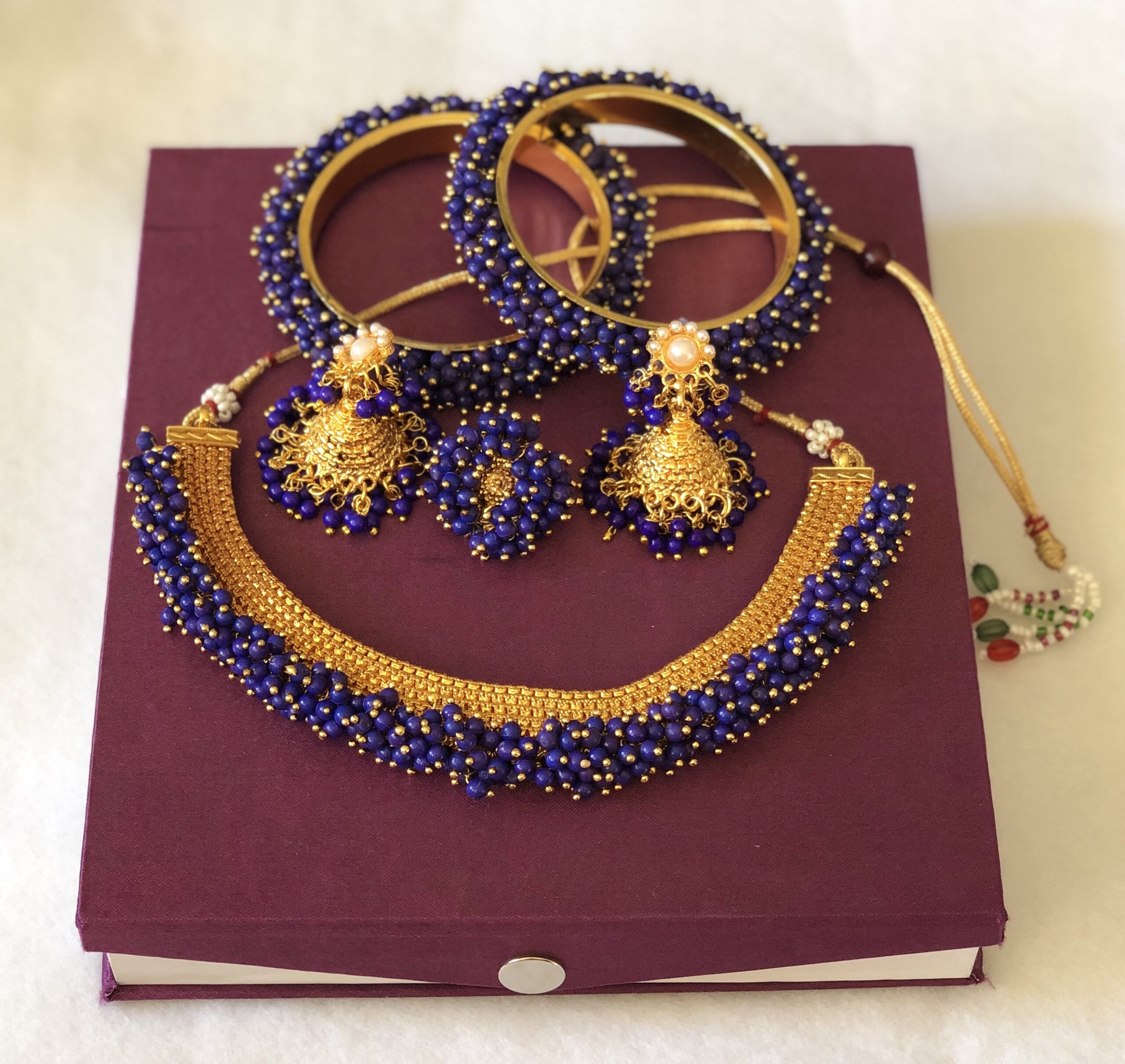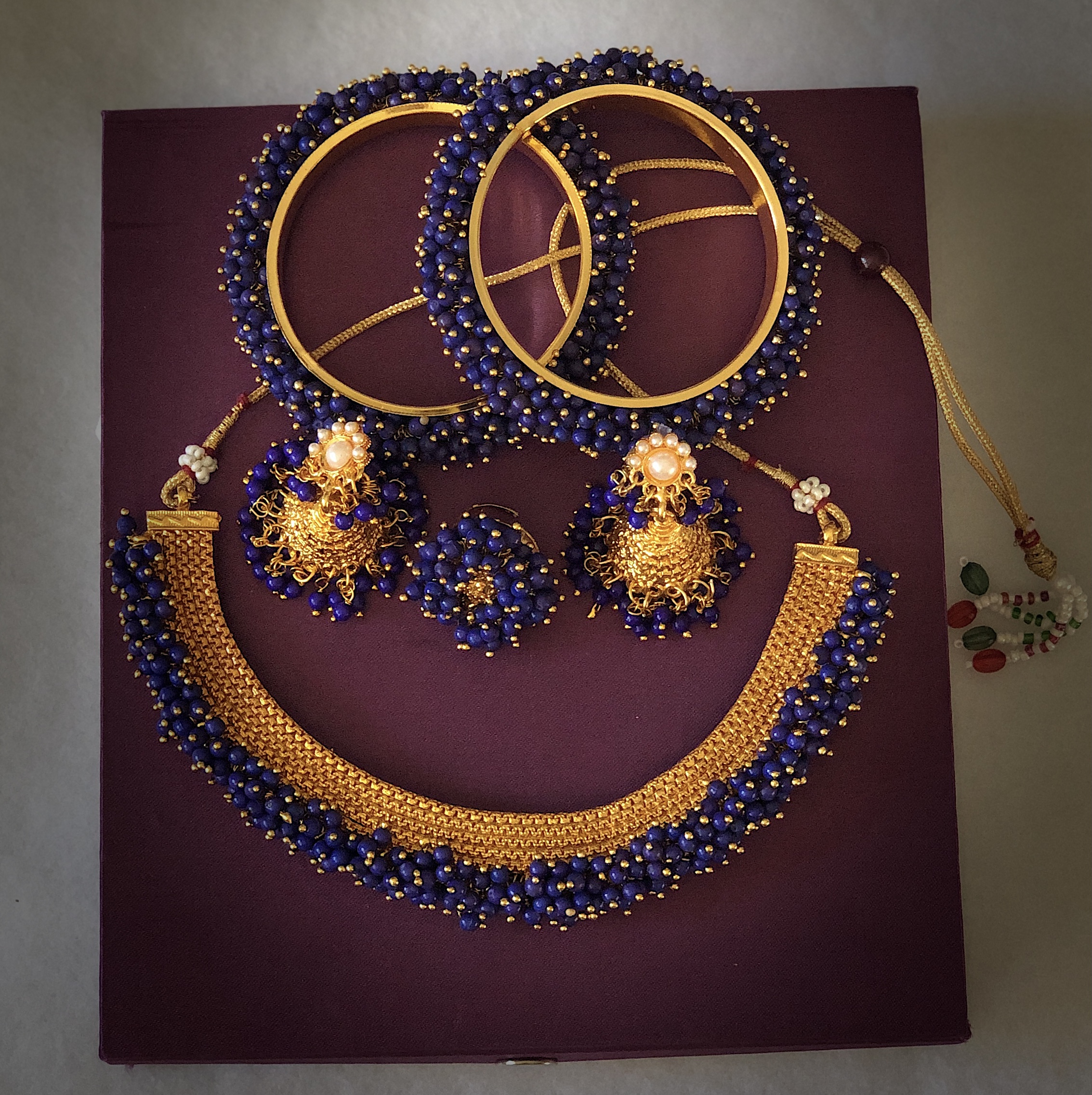 MADHURI is an amazing Necklace Combo set. It is made with great quality materials. Bright Royal-Blue beads bunched up to make this amazing set, will definitely be you go-to set for any occasion.