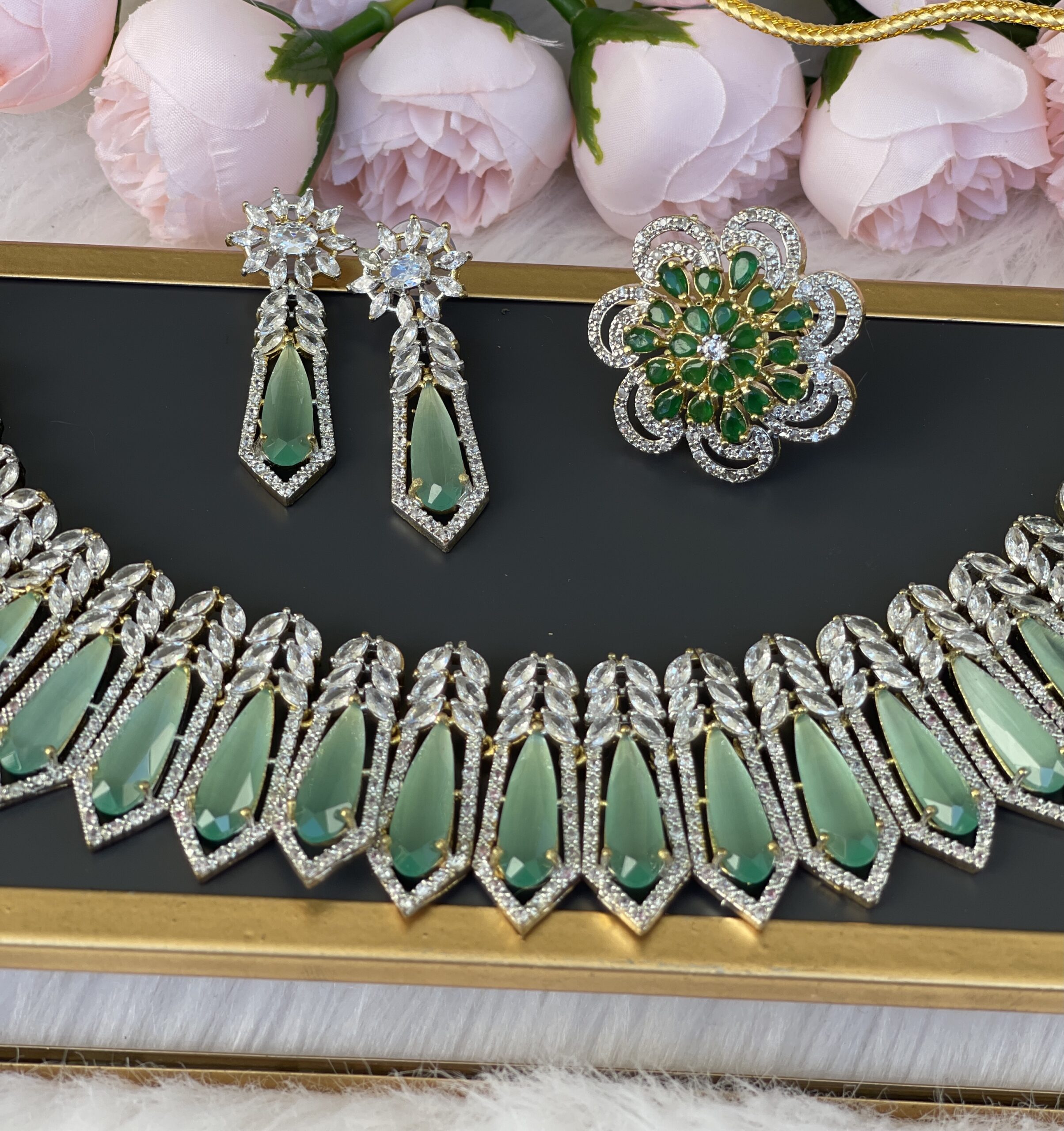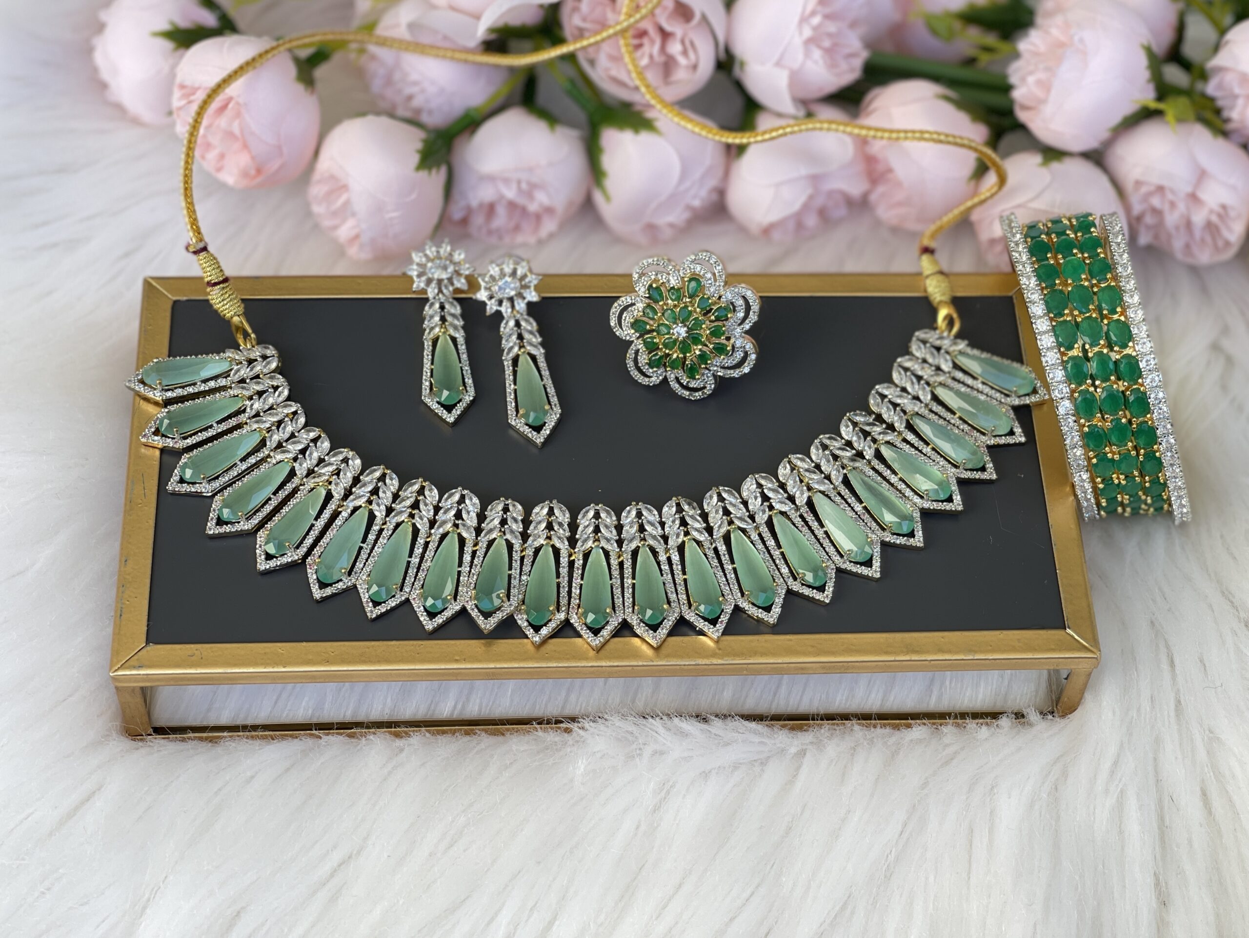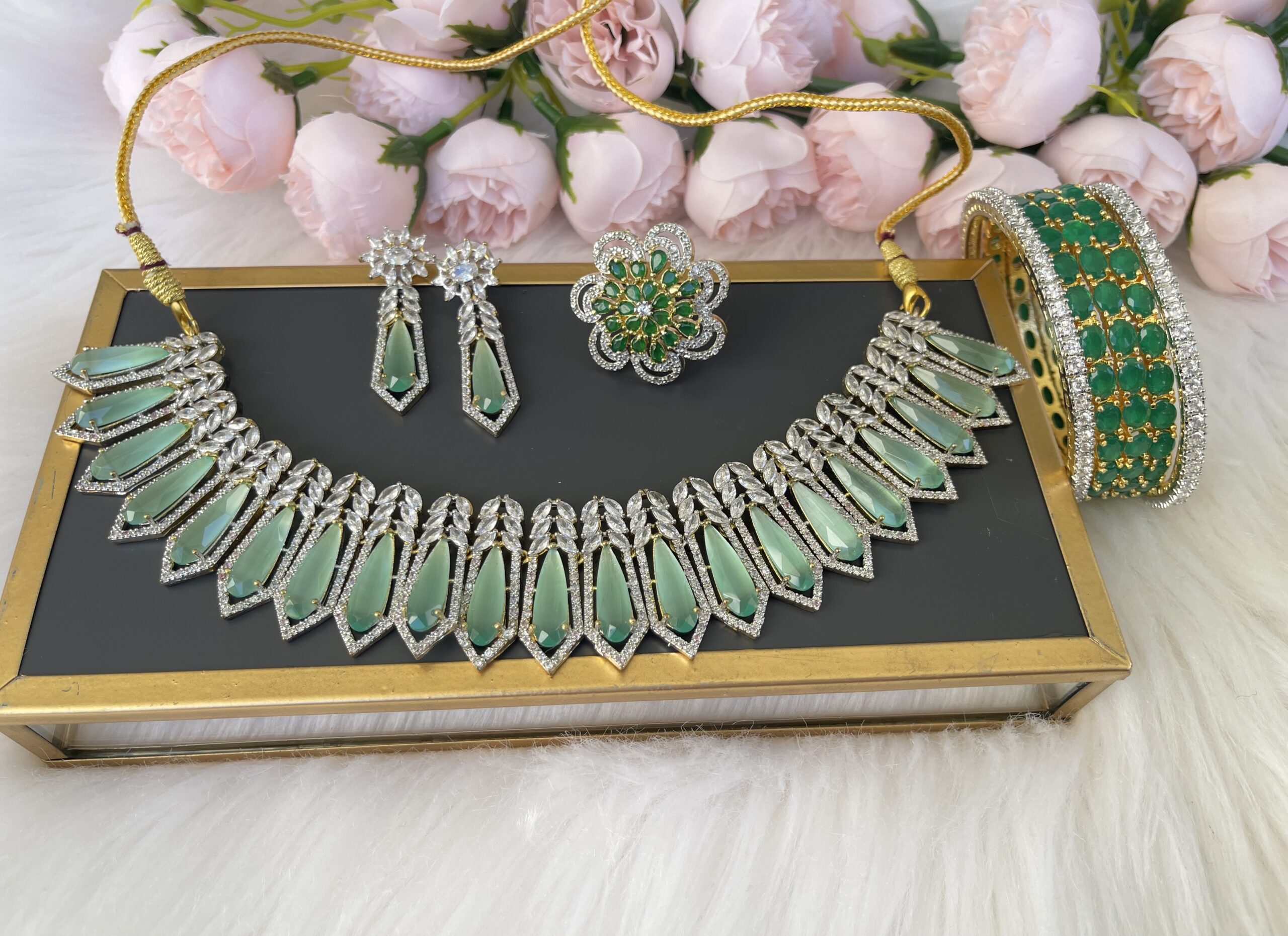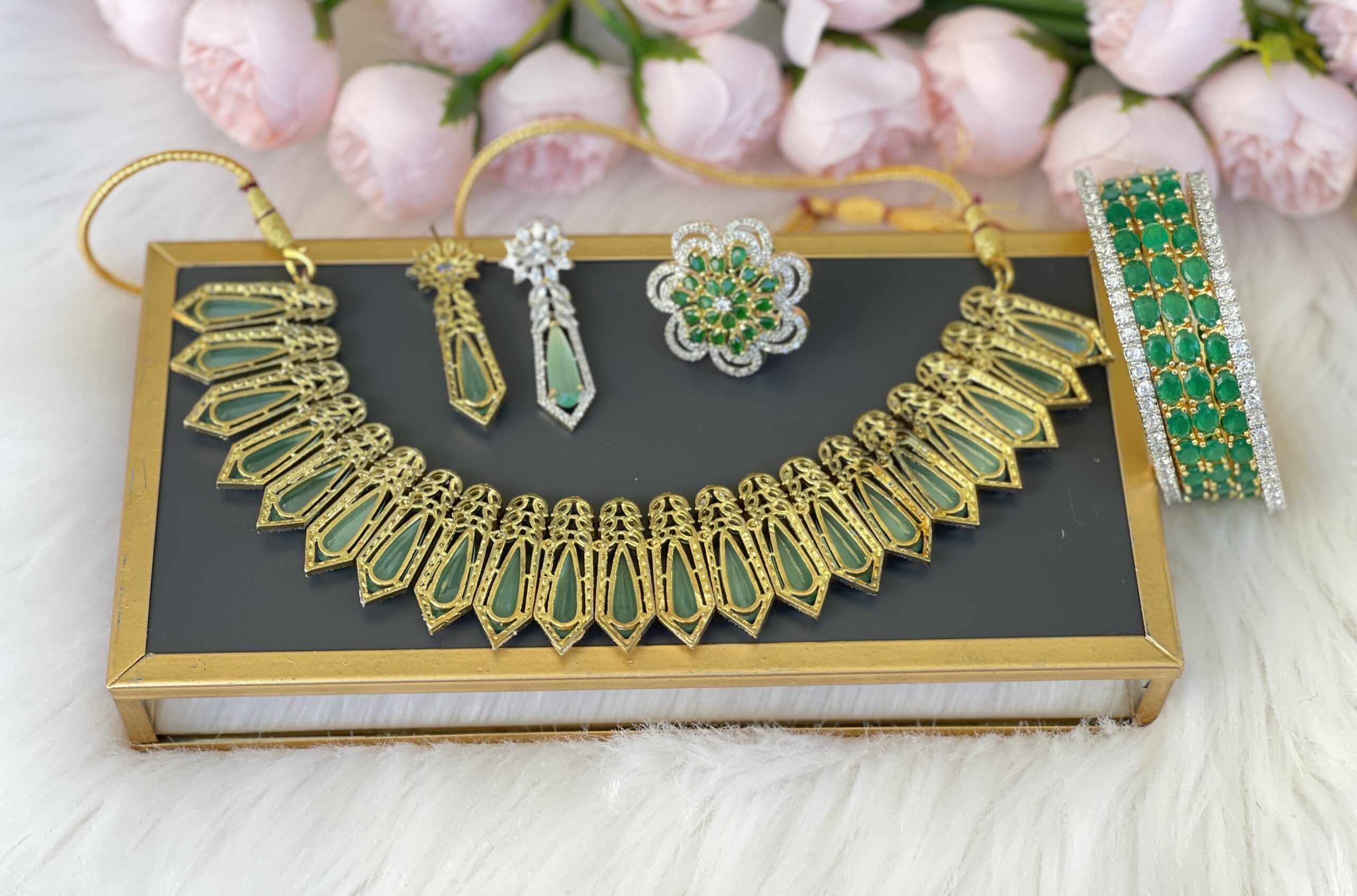 ARIYA Â set is packed with high quality American Diamonds and Onyx stones – Mint Green. This is a value package of necklace, bangles, earrings and ring, a $150 value. you may think that the quality might have been compromised to make it that cheap but NOPE, quality is something that is never compromised at GURAS.