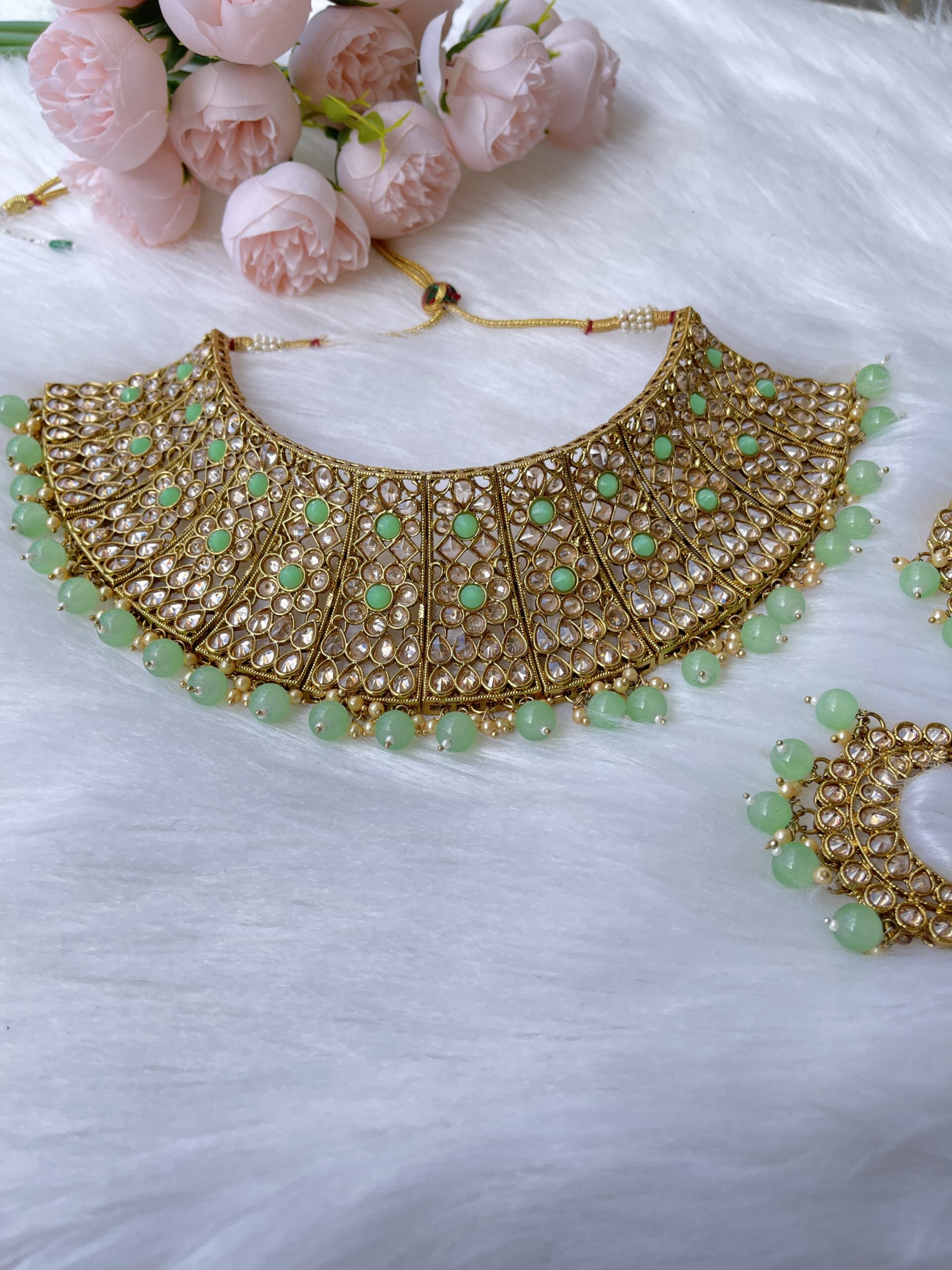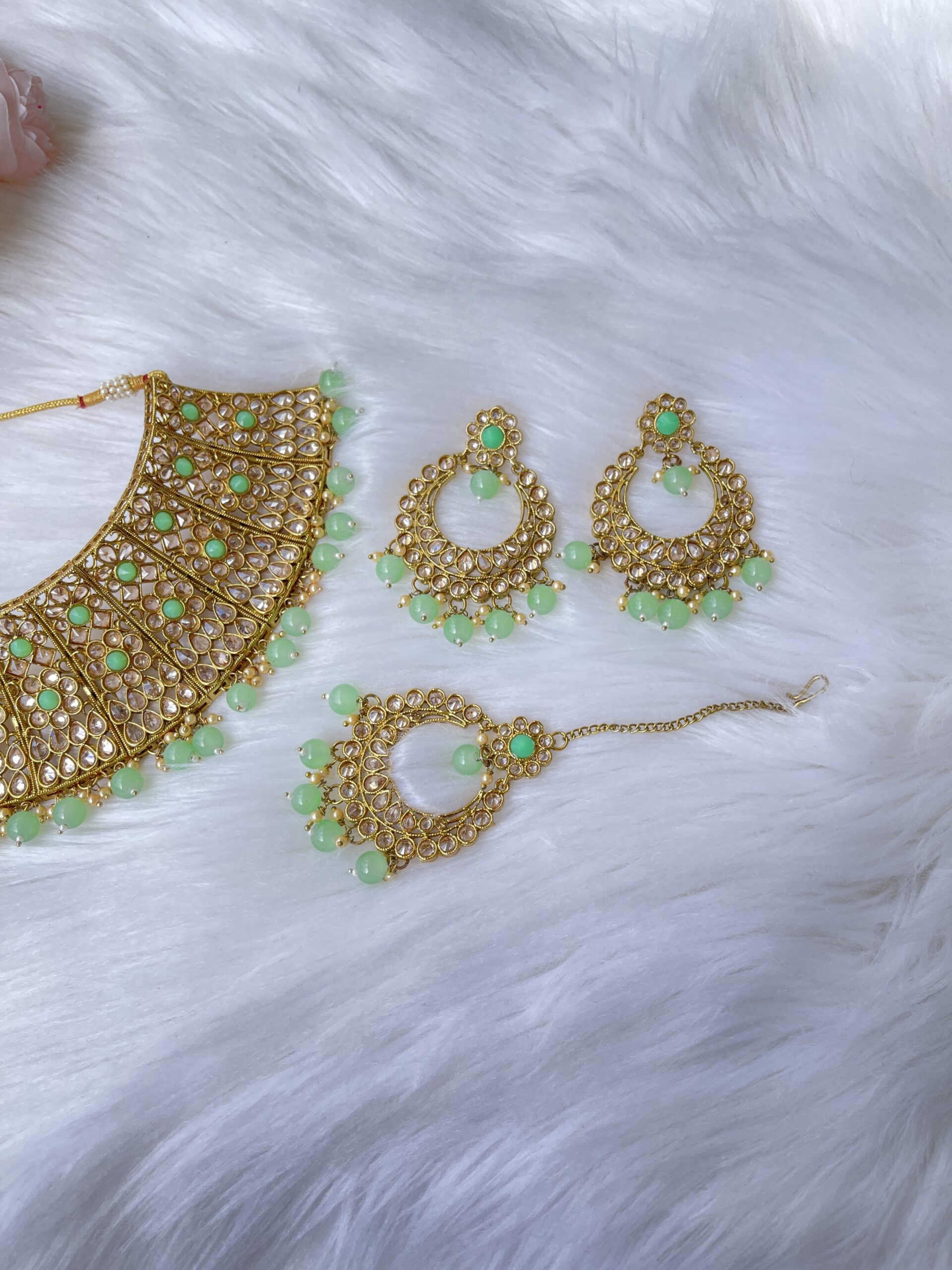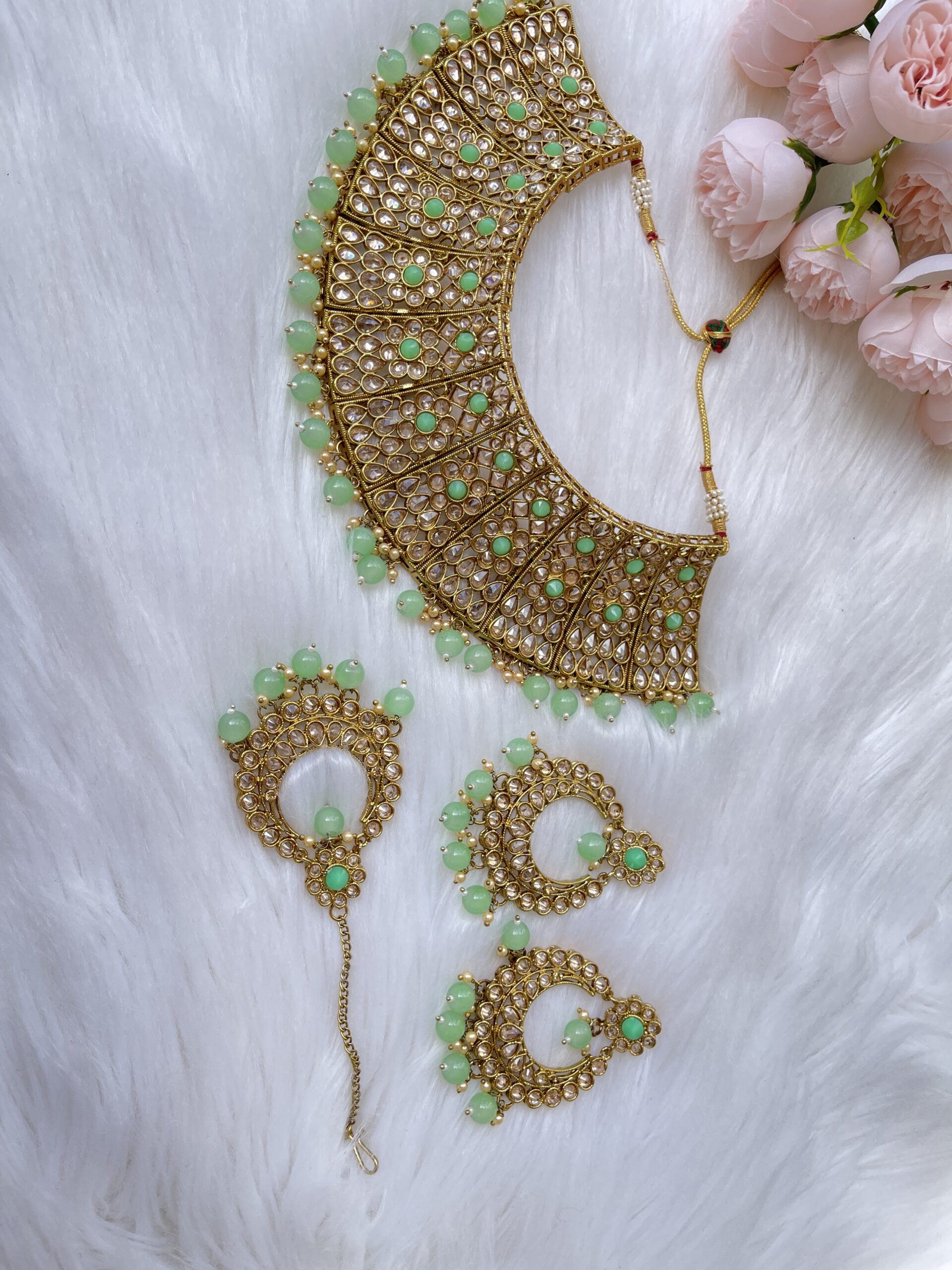 MAAHI is here to keep you mesmerising. MAAHI is a semi-bridal set made with premium quality materials. Comes in a BOLD Gold and Mint-Green color with reverse AD studded to be and Imitation pearls enhancing its classic – ness.