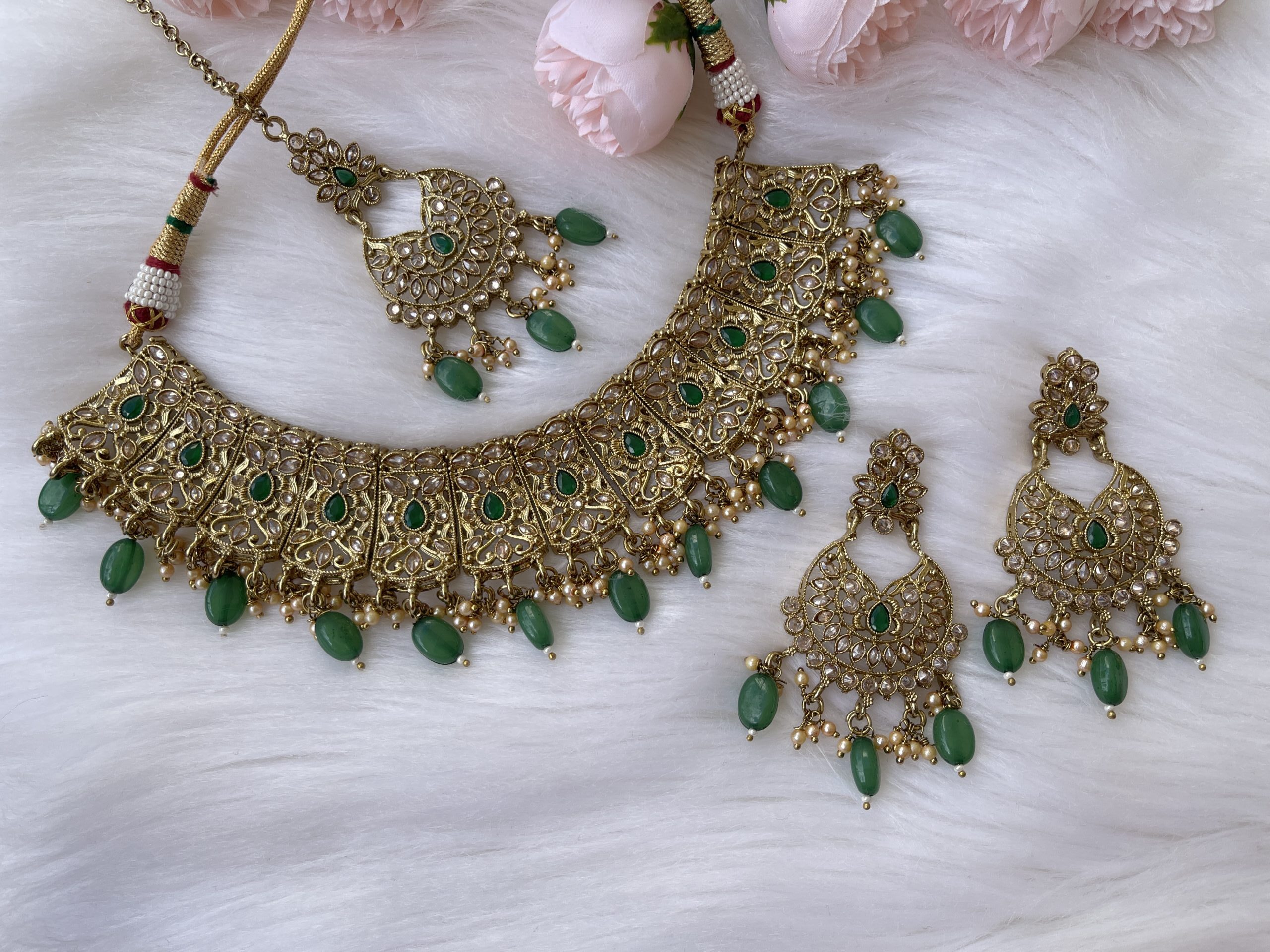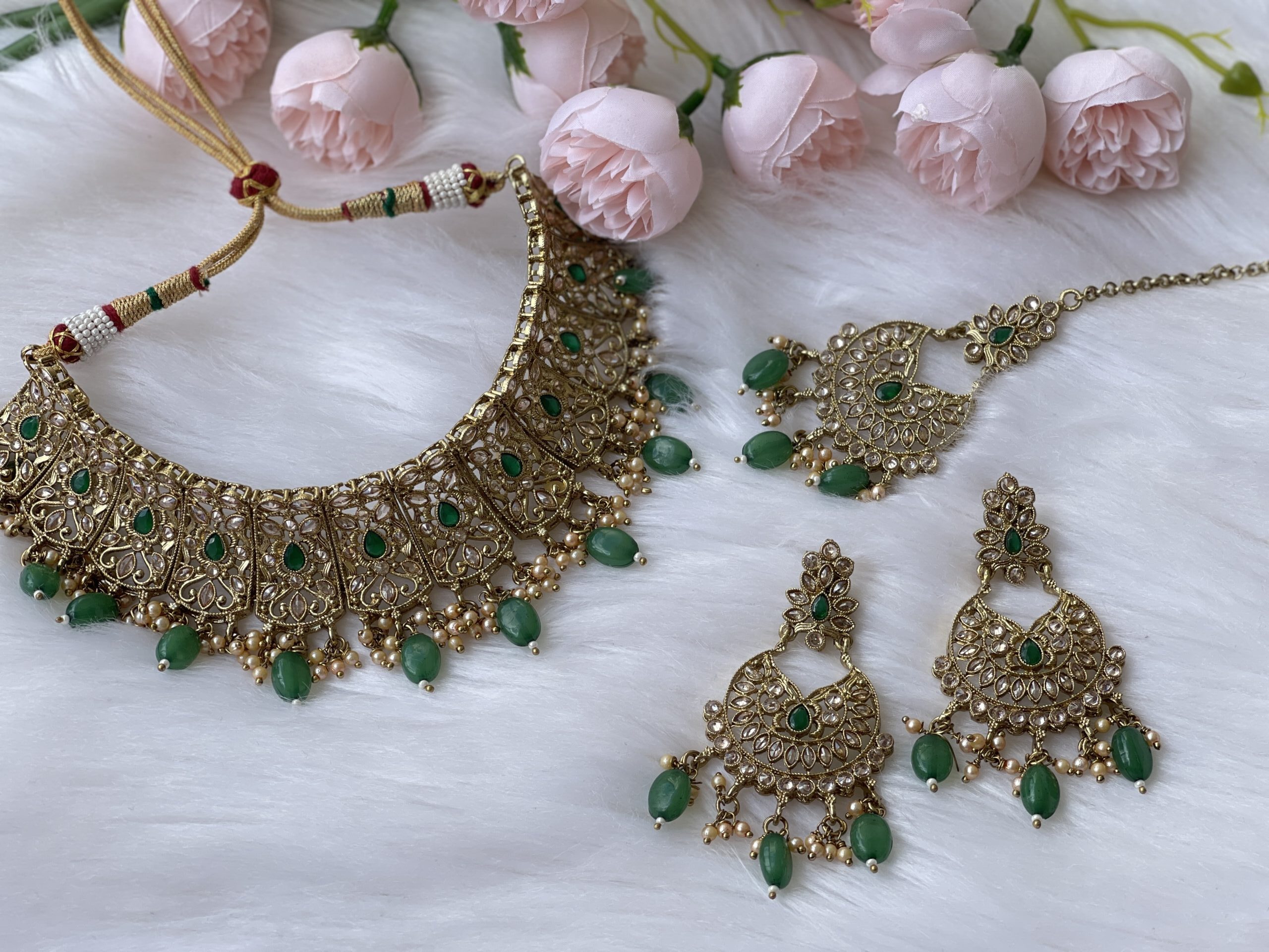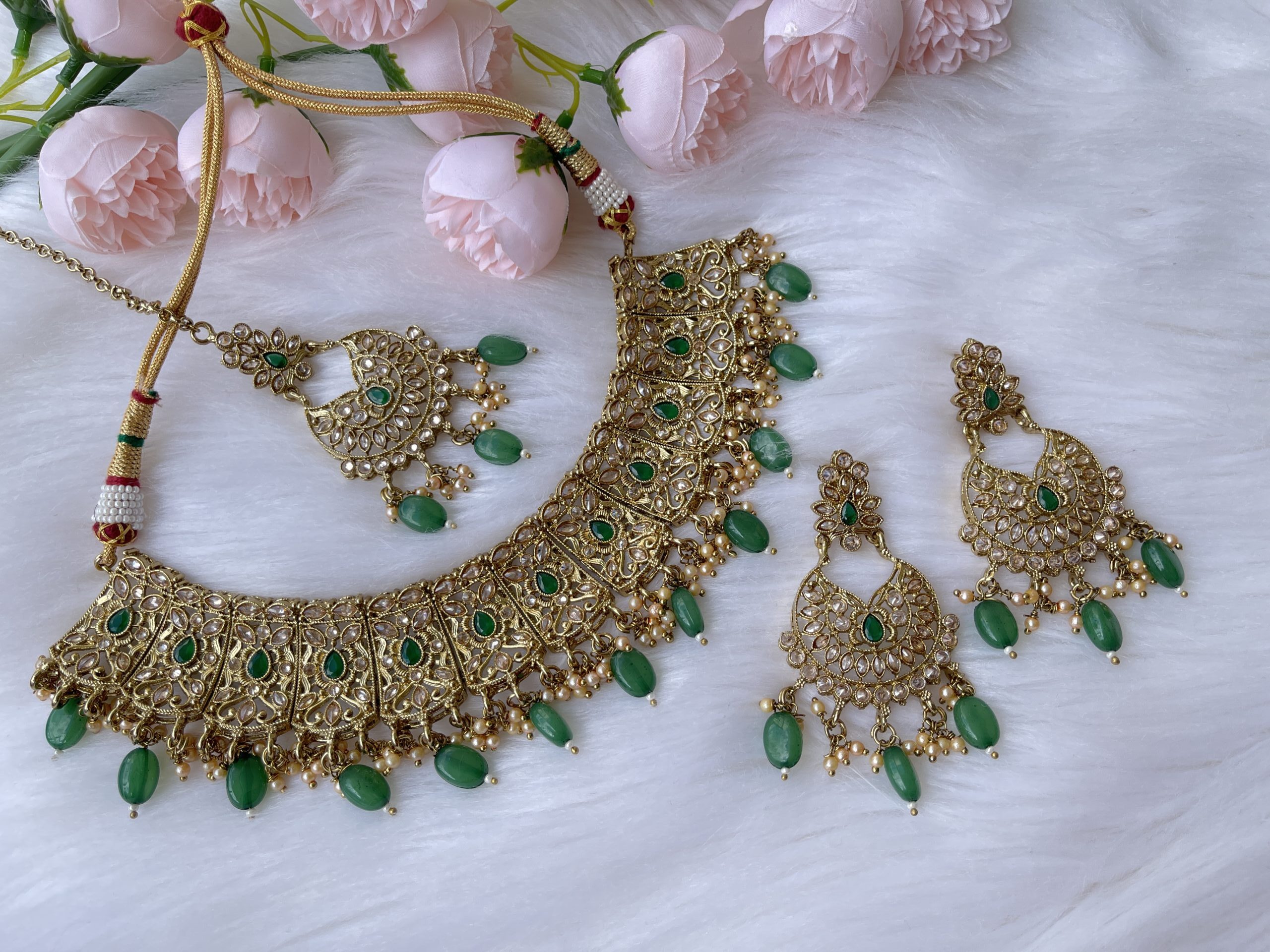 PRINSHA is beautiful set made with Mehendi Gold Polish. PRINSHA is a set made with premium quality materials. Comes in a BOLD Gold & Green color with reverse AD studded to it and Green beads enhancing its cuteness.