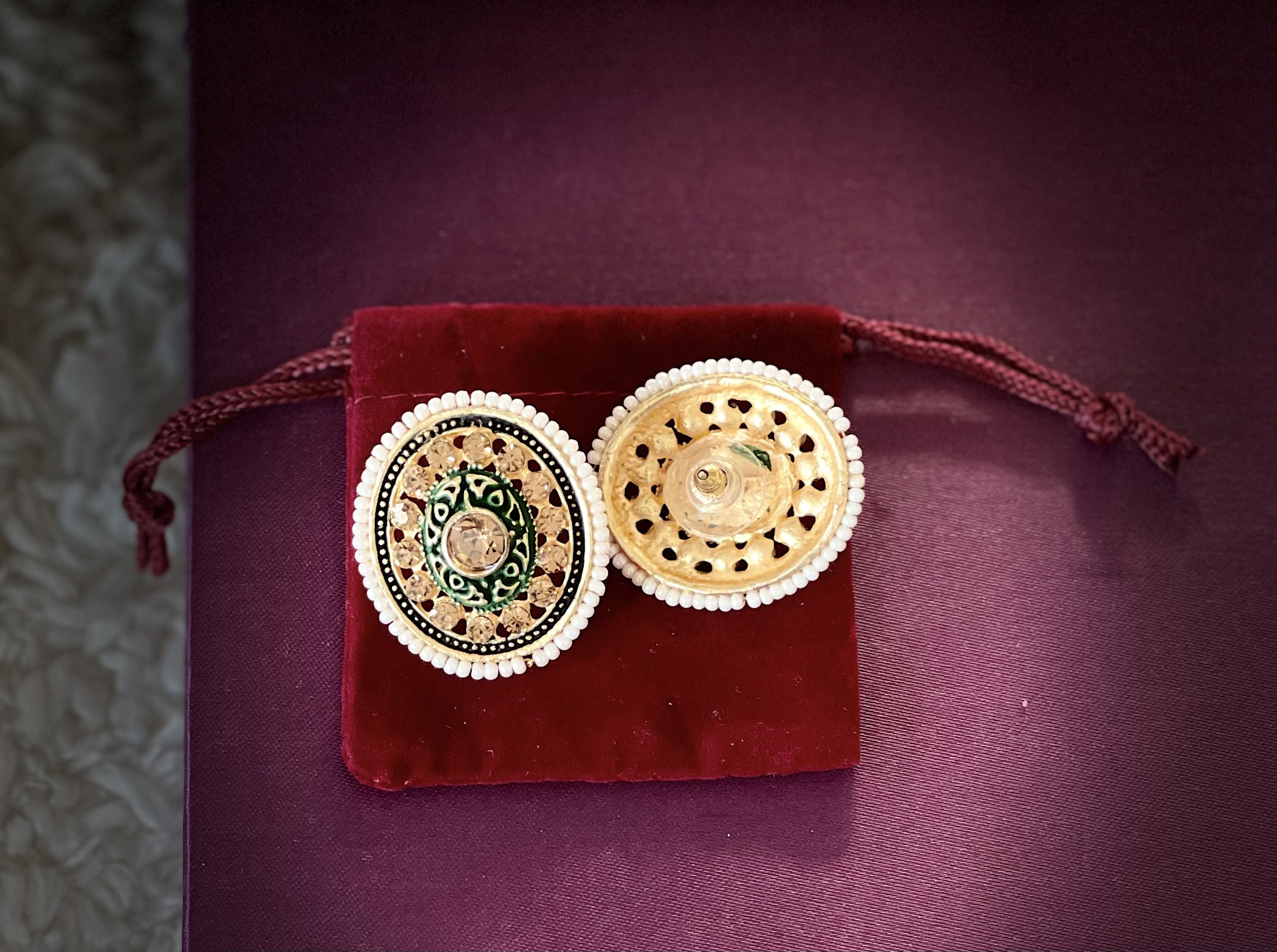 Meenakari work Earstuds with Green color to enhance its beauty. beautifully outlined with pearls.