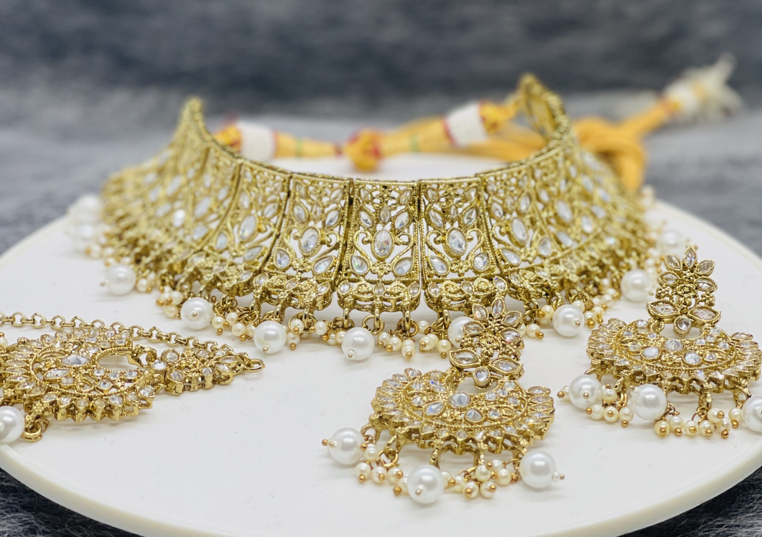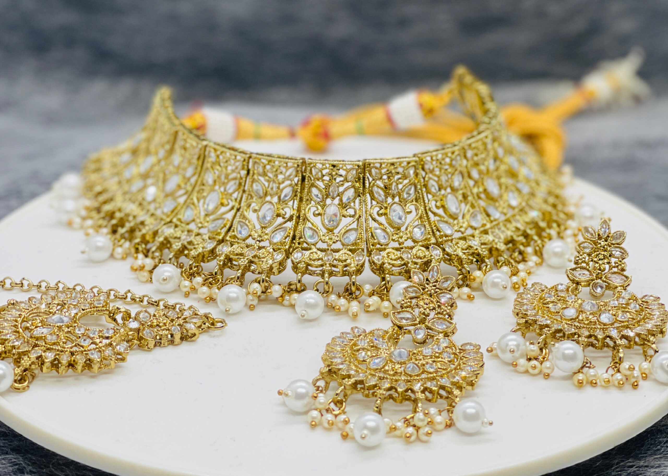 PRINSHA is beautiful set made with Mehendi Gold Polish. PRINSHA is a set made with premium quality materials. Comes in a Mehendi Gold with reverse AD studded to it and Imitation Pearls enhancing its beauty.