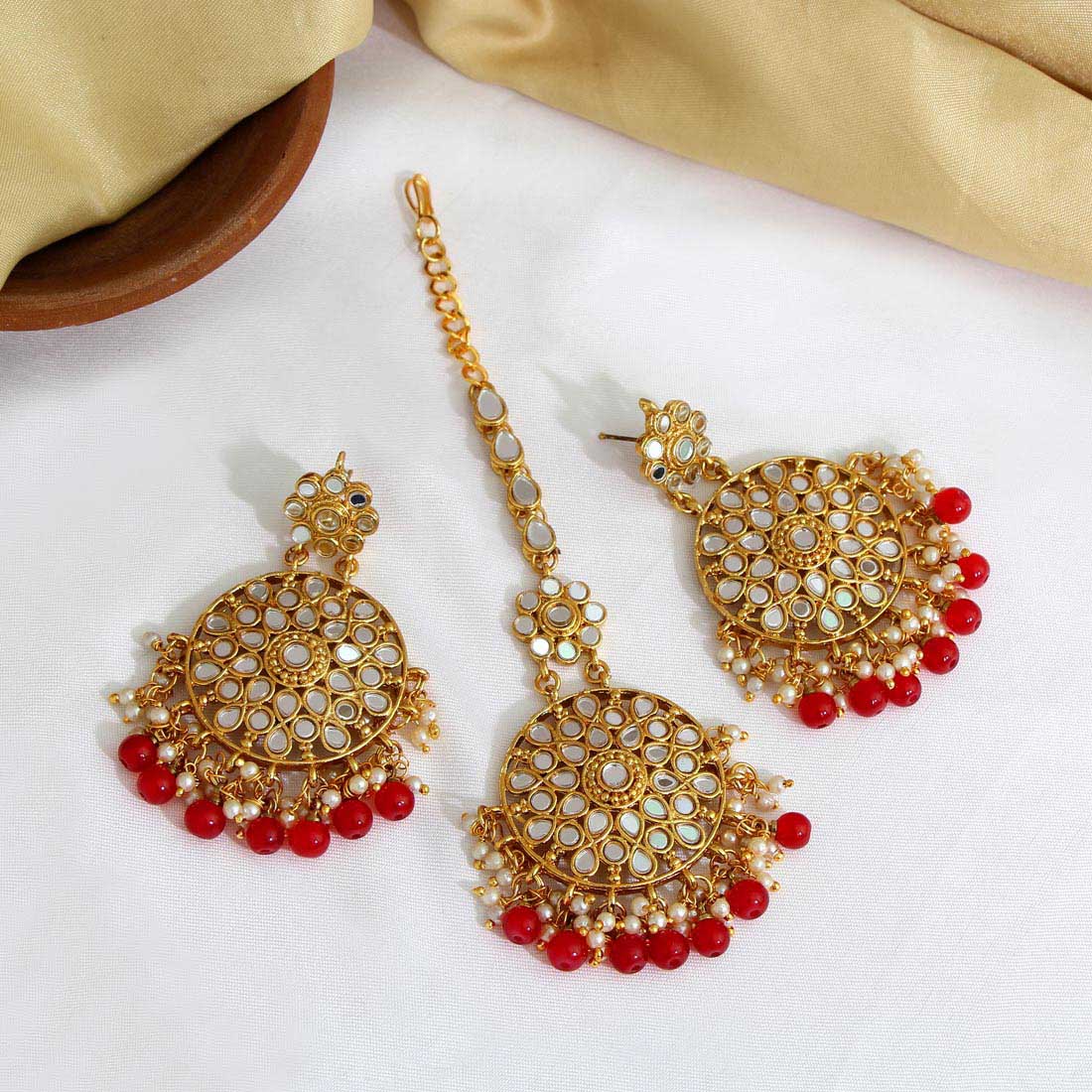 Red Color Mirror Kundan Earring Tikka Set.