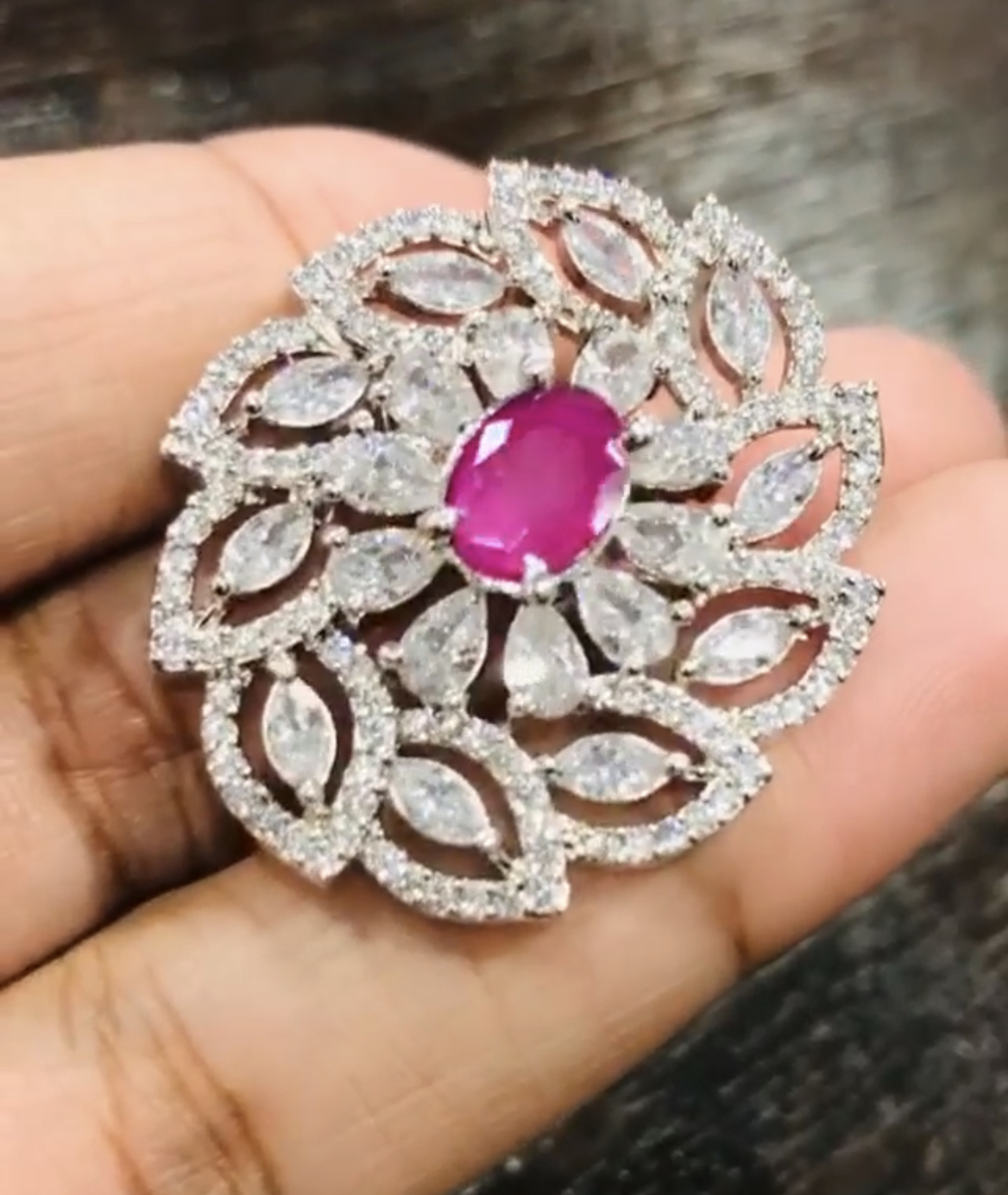 Size adjustable ring made with American Diamonds, Ruby (Lab-Created) and rhodium plated over Alloy.