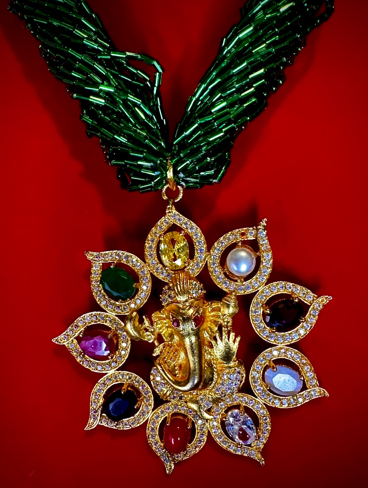 Amazing design made of gold Panchadhatu, Multicolor gemstones and crystal beads. very light yet very gorgeous. Can be worn with Kurtha, Lehenga or Saree or anything…it will make any look stand out.