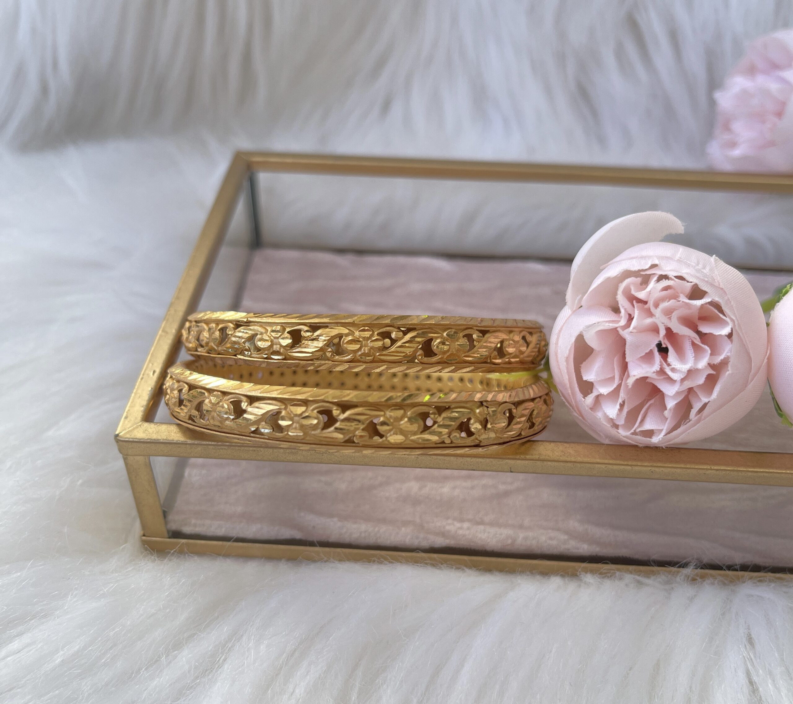 Rajashi is a set of two bangles made with antique matte gold finish look in Flower Pattern. It is so beautiful and also the best part is you can wear with all your outfits; be it traditional or not!