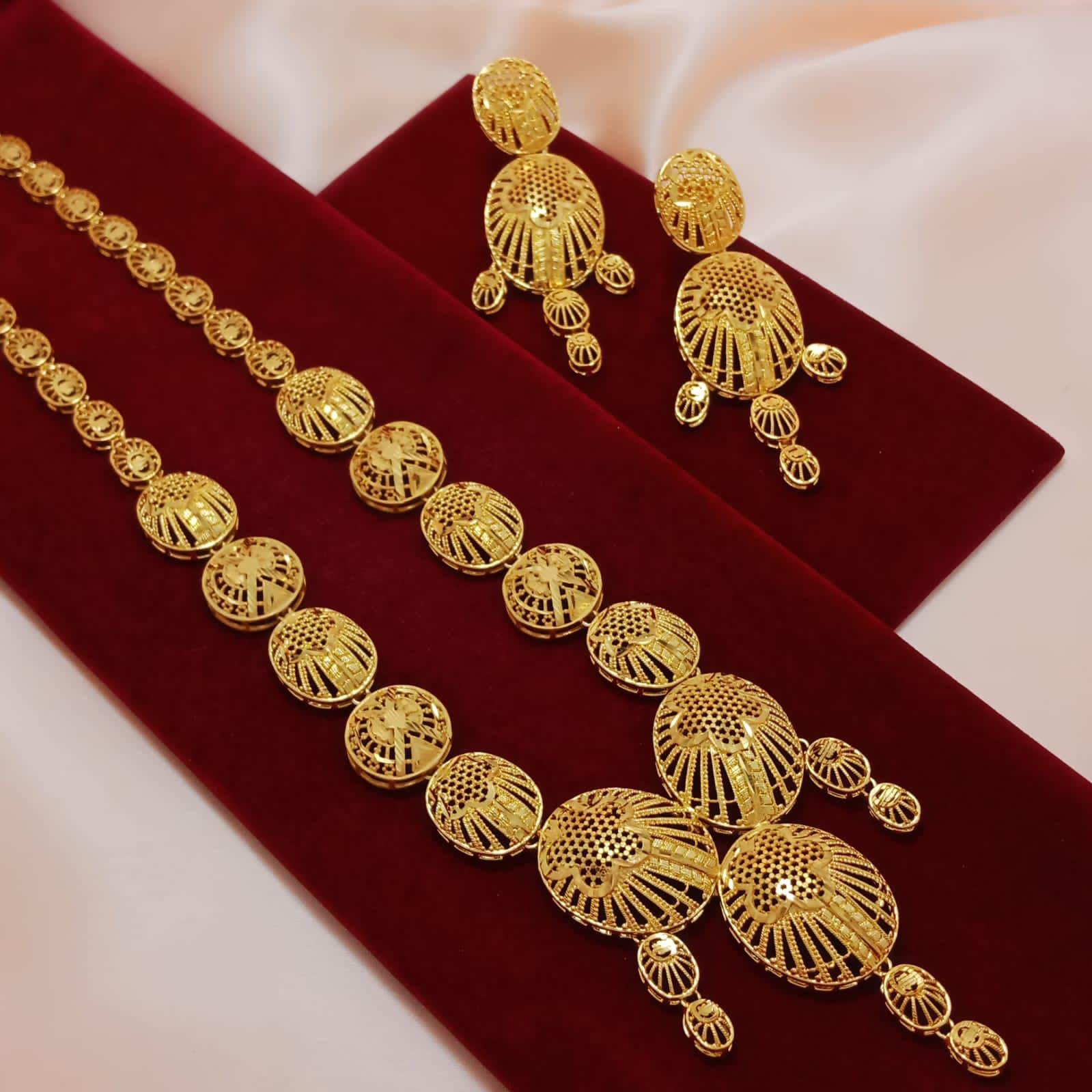 One gram gold plated haraam/haar with matching earring set. Heavy in looks yet, very light in weight.