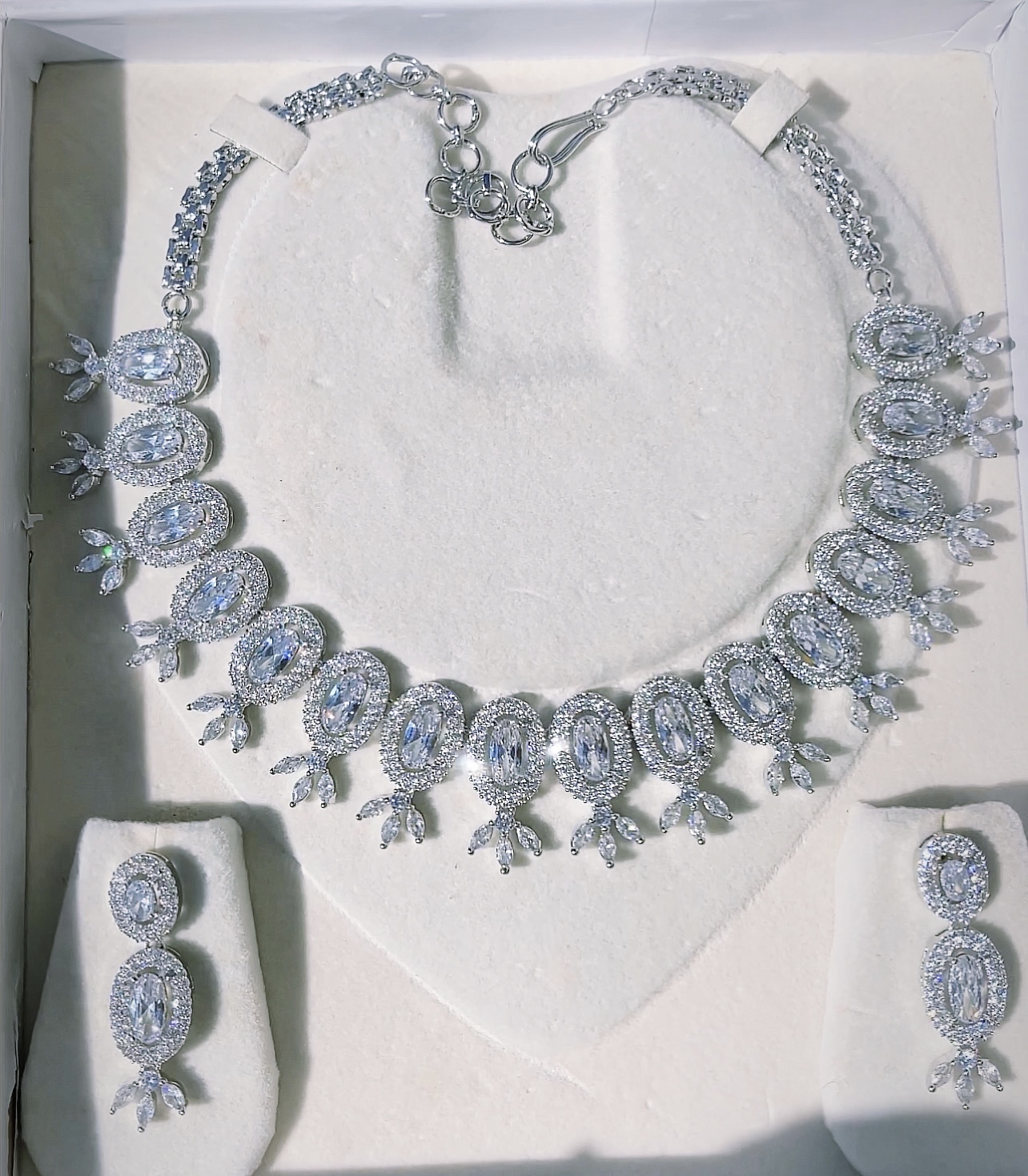 Small yet beautiful American Diamond Set made with Premium quality American Diamonds and Rhodium plating over alloy. Amazing quality for a great price.