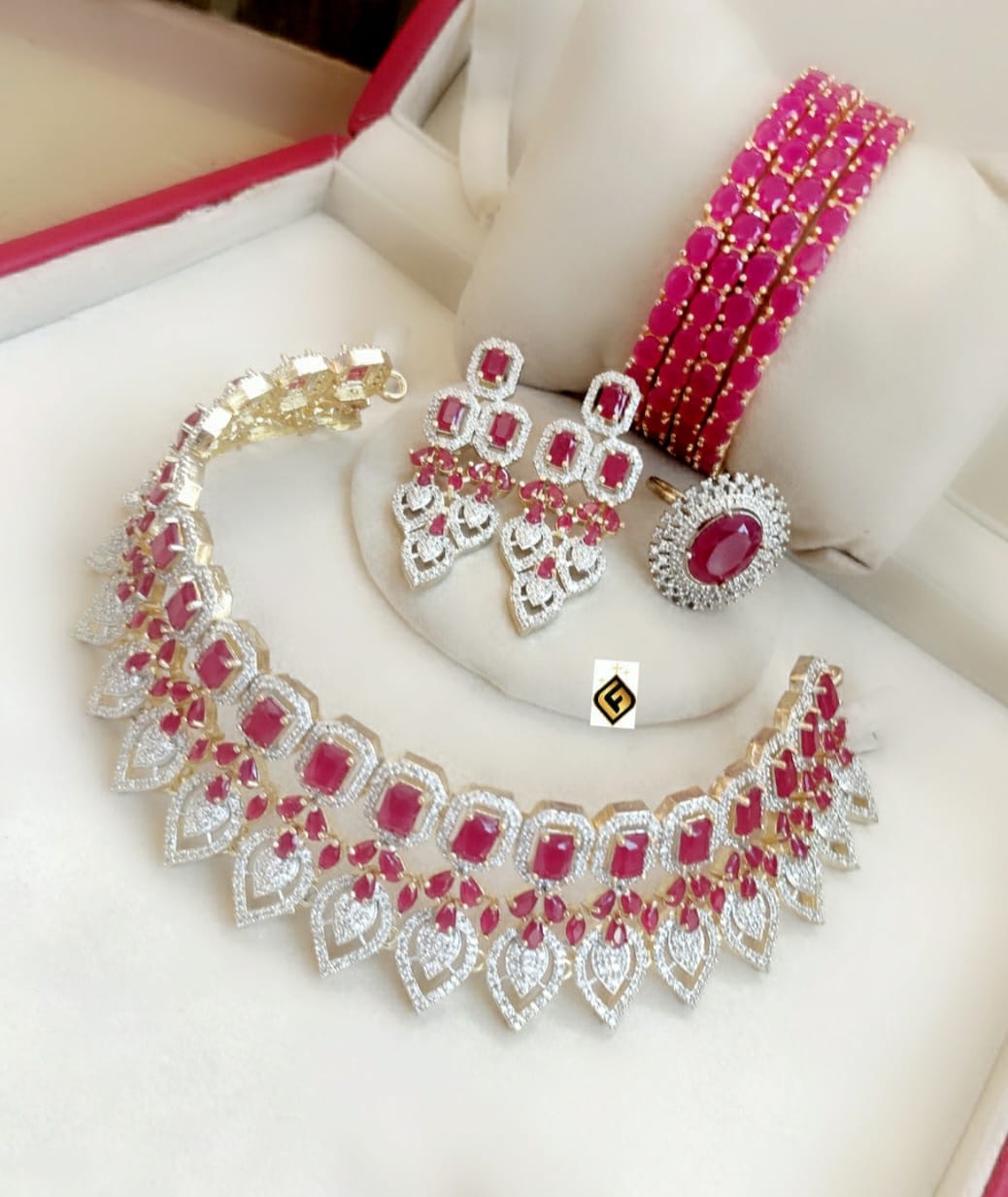 LATA set is packed with high quality American Diamonds and Lab-created Ruby. This is a value package of necklace, bangles, earrings and ring, a $150 value. you may think that the quality might have been compromised to make it that cheap but NOPE, quality is something that is never compromised at GURAS.